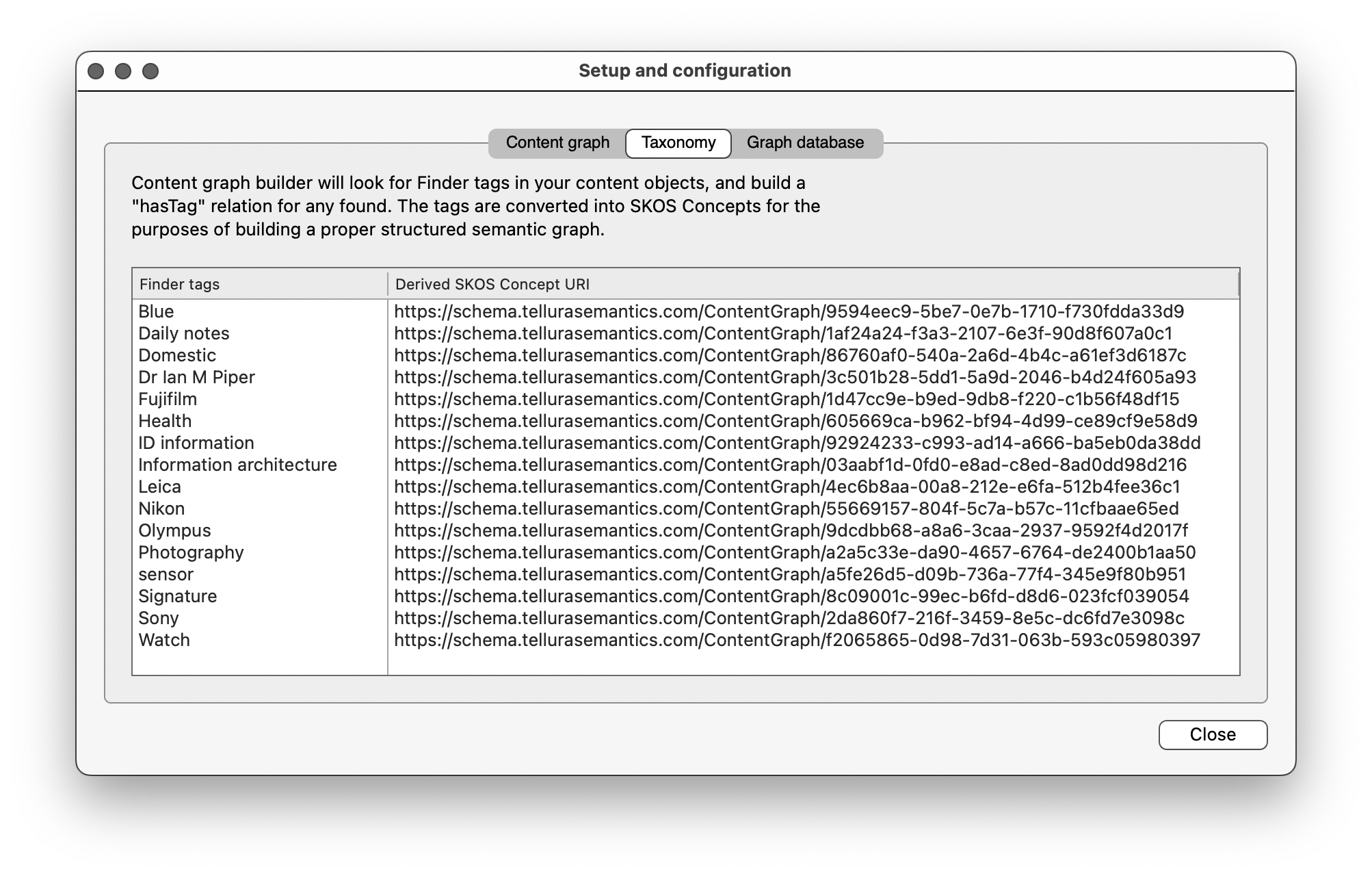 IN the example in the screenshot above, the Finder tag Olympus is converted into the URI http://schema.tellurasemantics.com/ContentGraph/9dcdbb68-a8a6-3caa-2937-9592f4d2017f.