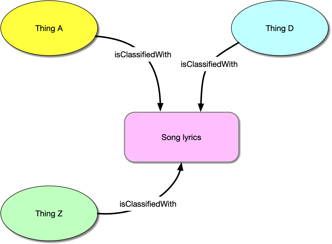 The important thing to note for our content graph is that by building these relationships, we are in effect linking the objects themselves together. They have something in common; they are all classified with the same concept; Song lyrics. There is thus an implicit relationship between the things. A single object might have a number of linked concepts, and those concepts might be used to classify a number of objects, so we have the start of a network - a content graph. Note that I've left out the inverse classifies relationships from the diagram, but they are explicit in the content model (see below). The inverse relationship is important, because eventually it will allow the user to explore the graph in multiple dimensions and ask questions like "what content objects are about song lyrics?"